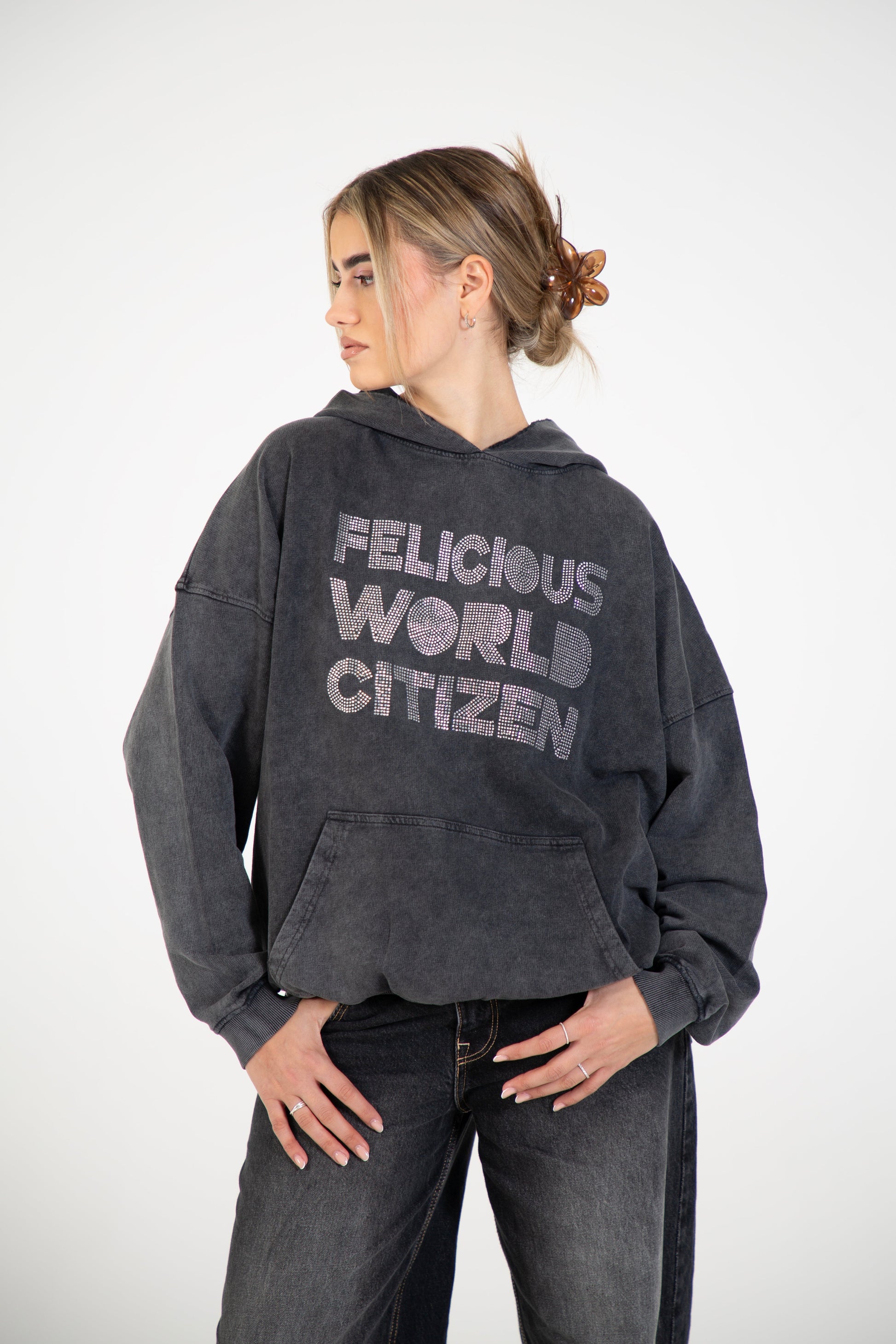 Vintage Hoodie Rhinestones Black Washed